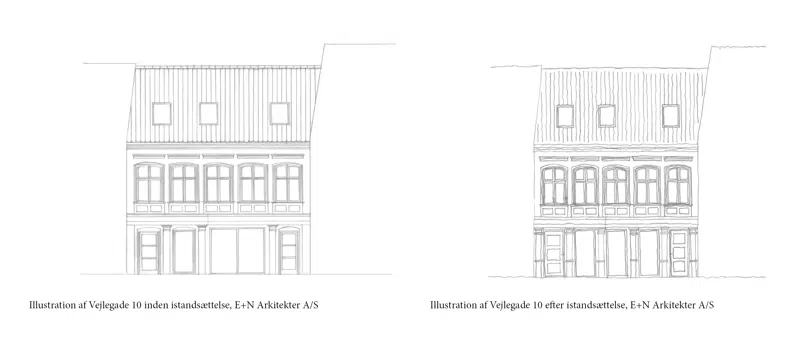 Istandsættelsen har genskabt bygningens oprindelige facadetakt og styrket det arkitektoniske helhedsindtryk mod Vejlegade. Stueetagen er genopmuret, så vinduesakserne igen flugter med 1. salens, og samtlige vinduer samt gadedøren er udskiftet. I stueetagen er der indsat nye tofags korspostvinduer i de nye murhuller, og bygherre har fået fremstillet en ny hoveddør, der tilpasses husets proportioner. På 1. sal er de tidligere vinduer udskiftet med nye korspostvinduer.
