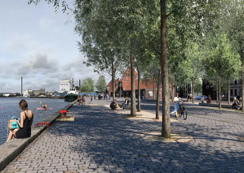 På Honnørkaj vil man kunne tage ophold på plinte og søge skygge under trækronerne på en lun sommerdag. Illustrationen er lavet af Erik Brandt Dam Arkitekter og kan afvige fra det endelige resultat.